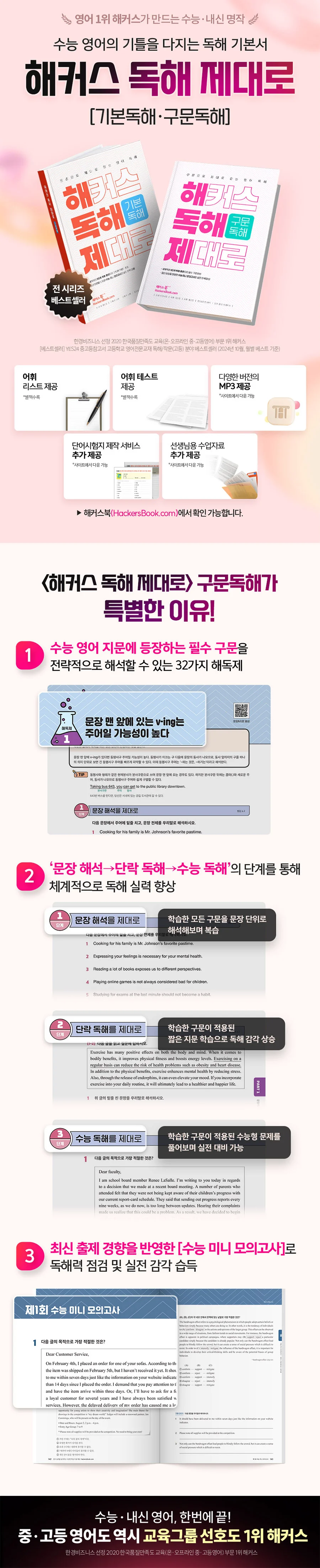 3단계) 수능 독해: 학습한 핵심 구문을 다양한 수능 유형 문제에 적용해보며 실제 수능까지 경험해볼 수 있습니다.