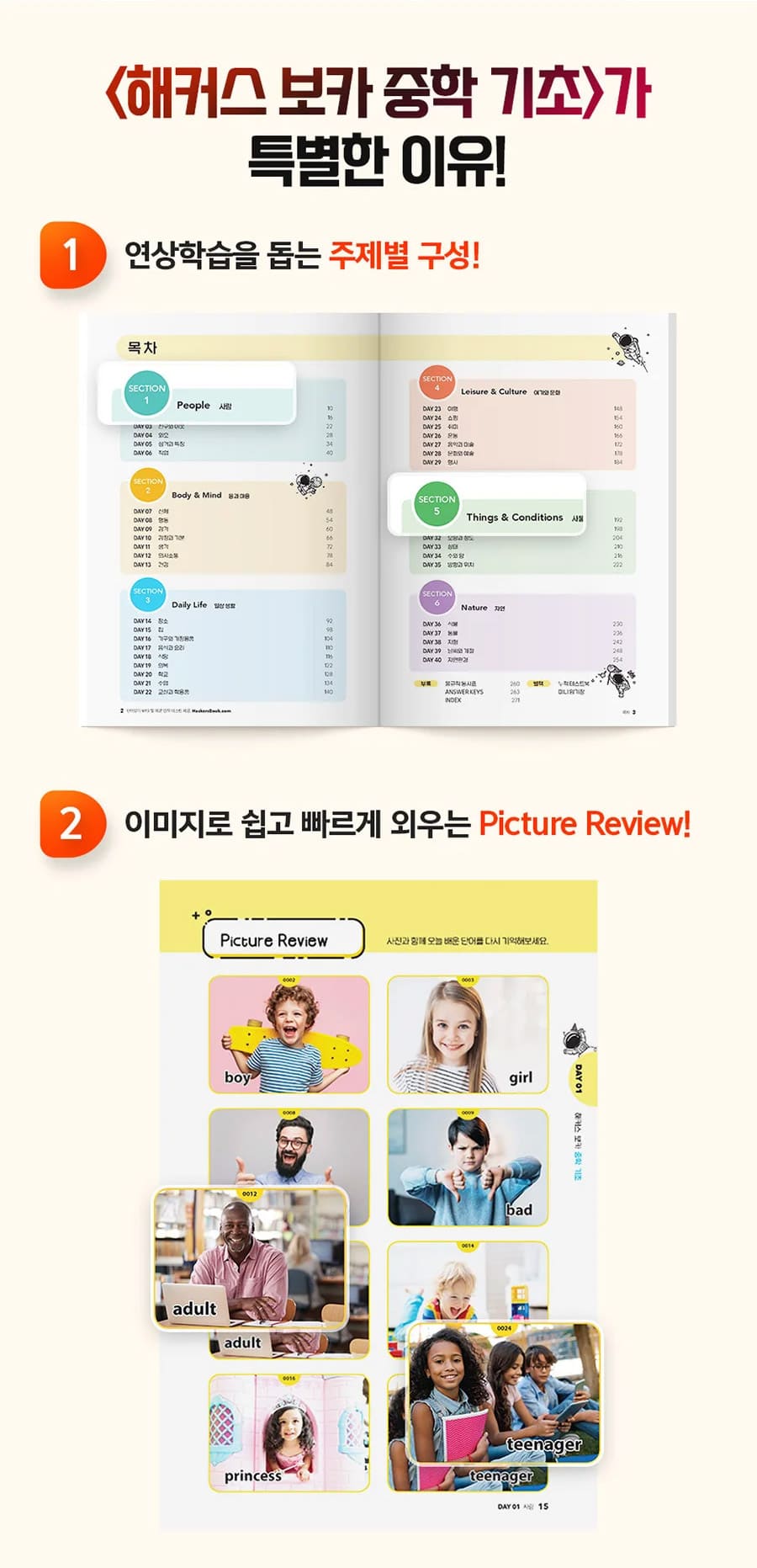 1) 연관된 단어끼리 모아 학습할 수 있는 주제별 구성의 연상 학습 효과로 단어 암기가 더욱 쉬워집니다.